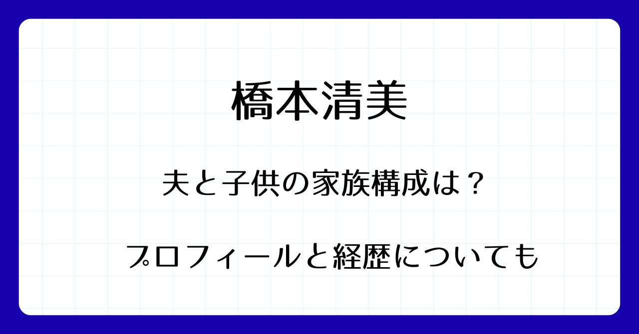 本記事では、橋本清美さんの夫や子どもを含む家族構成から、橋本清美さん自身のプロフィールや経歴まで、幅広く紹介していきます。